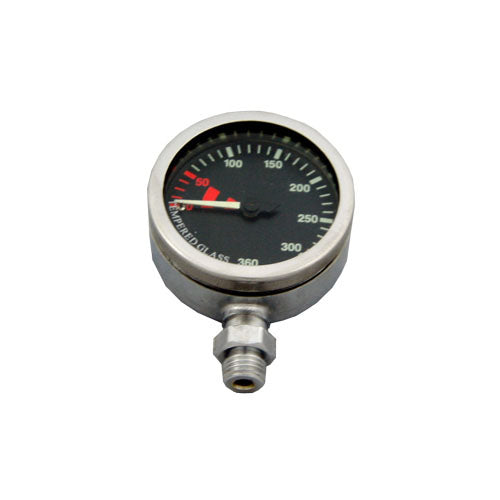 High-quality brass pressure gauge, suitable especially for main tanks. BLACK synoptic dial scale up to 360 bar. Comes with swivel with viton o-rings. Chrome plated housing.